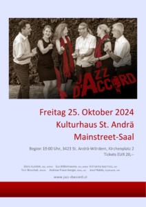 Jazz d'Accord Jazz d’accord am 26.10.2024 im Mainstreet-Saal St. Andrä September 11, 2024 Kulturhaus St. Andrä 3423 St. Andrä-Wördern, Kirchenplatz 2 Beginn: 19:00 Uhr Tickets: EUR 20,–